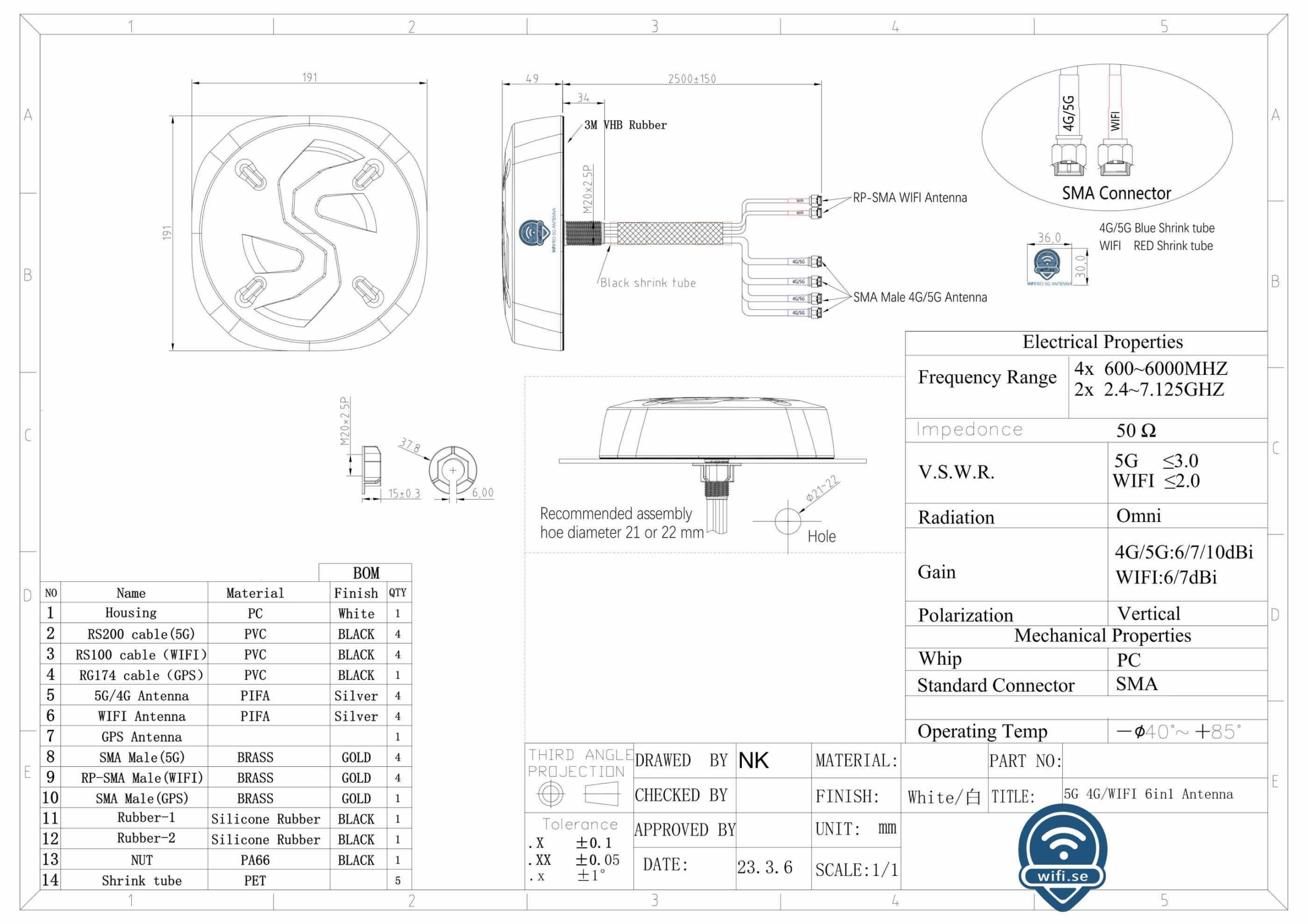 This package includes a 5G omnidirectional MIMO antenna that works for all mobile bandwidths, 2G/3G/4G/5G and is nearly 6G compatible. Specifically developed by us for optimal reception and speed. This antenna is equipped with a total of 6 cables. 4 LTE cables that connect directly to the router (5G). Four LTE and two WiFi cables for minimal signal loss. You get WiFi inside the vehicle and up to 50 meters outside the vehicle. The antenna elements are very powerful and provide a full 10dBi boost. An incredibly robust antenna that is also IP 68 certified. The antenna is 19 cm in diameter and 5 cm high, and due to its size, it has very powerful antenna elements. The antenna has a screw length of 60mm, which is perfect for installation. (Previously, we had 40mm, but now all screws are 60mm). See the attached diagram.